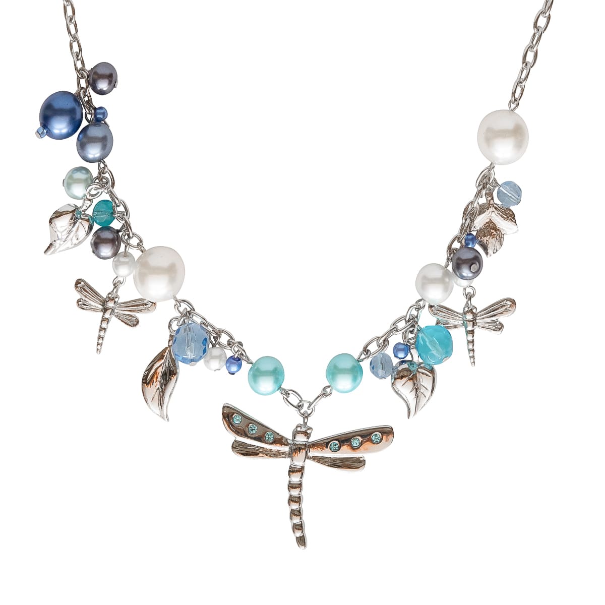 Die Libelle steht als Symbol für Freude und Leichtigkeit. Bei diesem Schmuckstück wurde sie liebevoll mit blauen, grauen, und weißen Kugeln kombiniert. Glänzende Blätter und kleine Libellen in Silber begleiten das Design gekonnt. Ein schönes Accessoire für den Sommer.