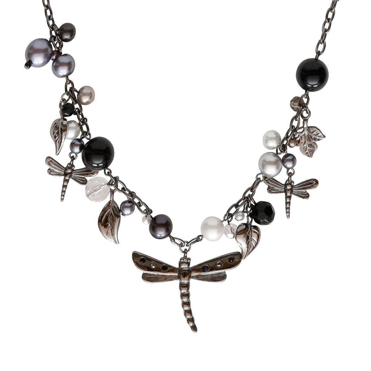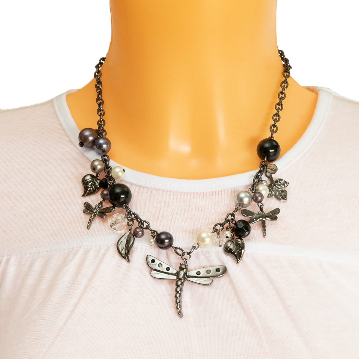 Die Libelle steht als Symbol für Freude und Leichtigkeit. Bei diesem Schmuckstück wurde sie liebevoll mit schwarzen, grauen und weißen Kugeln kombiniert. Glänzende Blätter und kleine Libellen in Schwarz begleiten das Design gekonnt. Ein schönes Accessoire für den Sommer.