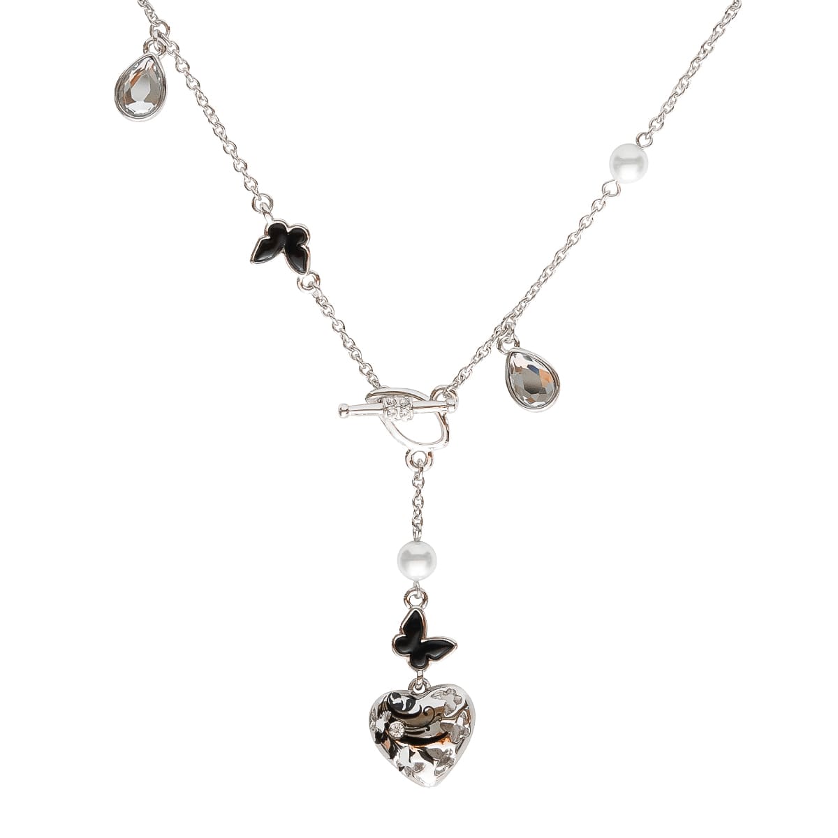 Der Schmetterling symbolisiert die Weiterentwicklung im Leben gemeinsam mit dem Herzen das Statement für jede Frau. Die liebevoll gestaltete Ankerkette mit weißen Perlen, schwarzen Schmetterlingen und funkelnden Schmucksteinen zeigt als Anhänger ein verziertes Herz. Der Knebelverschluss lässt sich von vorne öffnen und setzt die Y-Kette perfekt in Szene.
