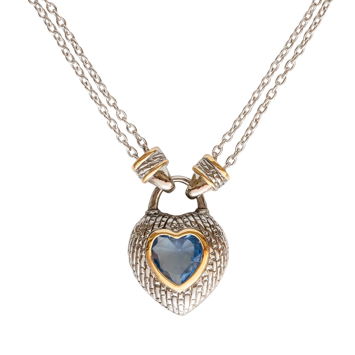 Fesche Kette im Trachtenlook. Betonen Sie gekonnt Ihr Dekolleté mit dem wundervoll verzierten Herzanhänger mit blauem Schmuckstein. Getragen an einer Doppelkette, aufwendig verziert mit goldenen Akzenten.