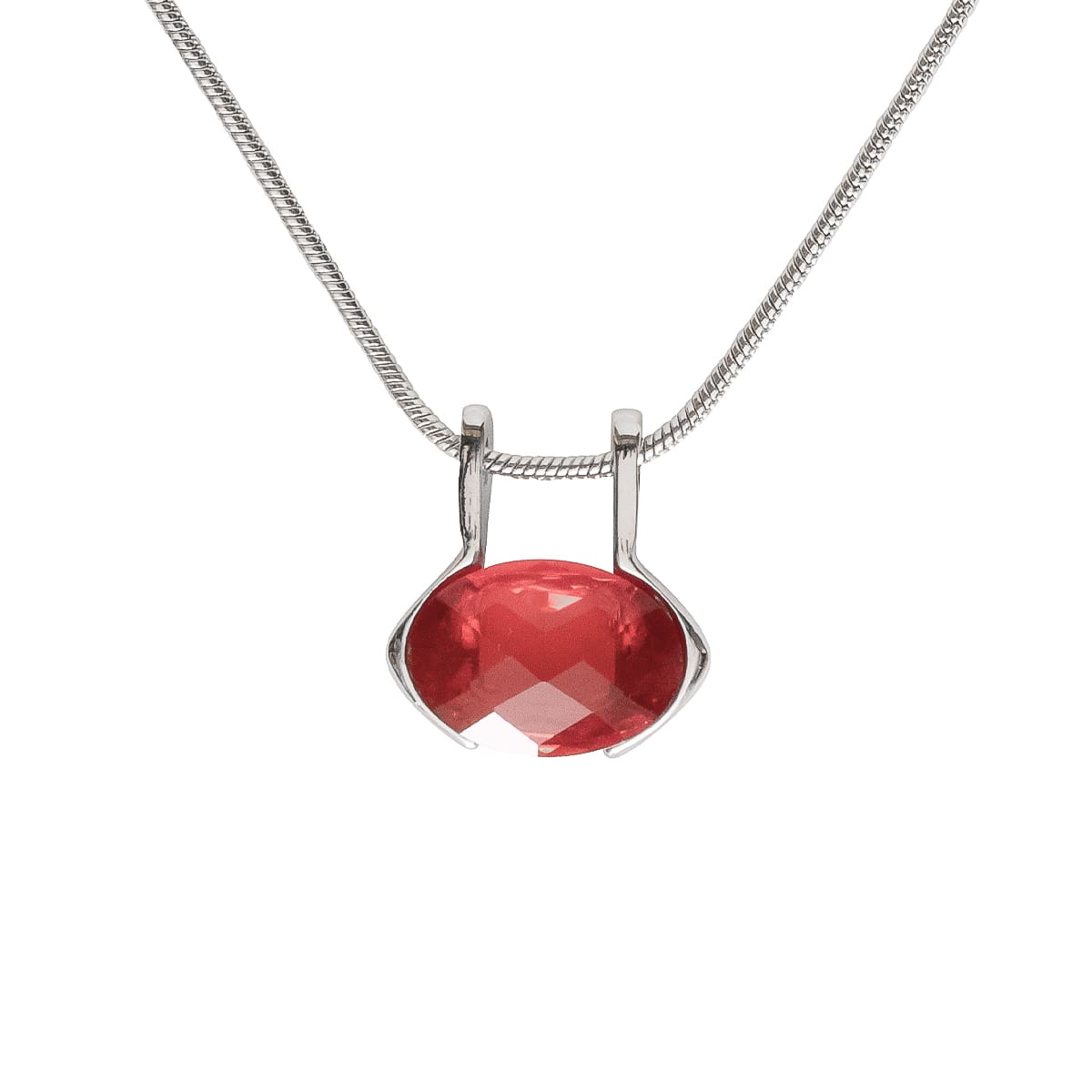 Hier steht der funkelnde Schmuckstein in strahlendem Rot im Mittelpunkt. Der edle Facettenschliff verleiht dem Stein seinen besonderen Glanz. Begleitet von einer schlichten silberfarbenen Schlangenkette ein tolles Schmuckstück, das Sie jeden Tag neu kombinieren können.
