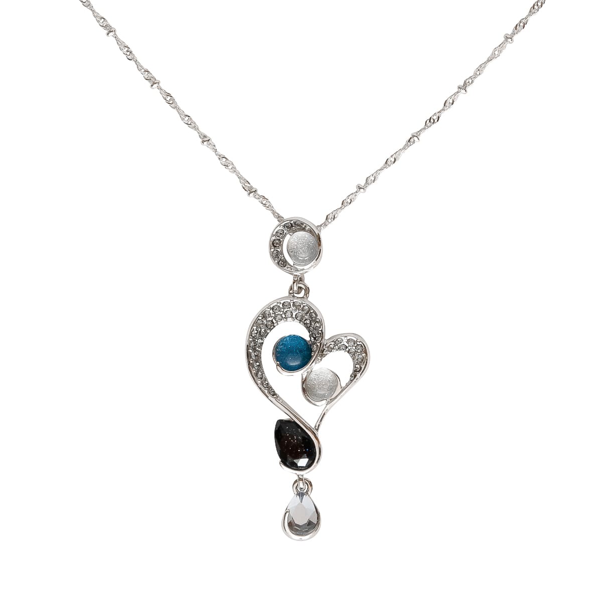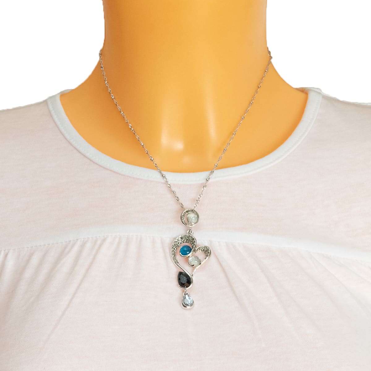 Der verspielte Herzanhänger wurde mit Liebe zum Detail gestaltet. Edle Schmucksteine in Blau, Weiß und einem dunklen Violett werden von vielen kleinen funkelnden Schmucksteinen gekonnt begleitet. Die gedrehte Kordelkette macht das Schmuckstück zu etwas ganz Besonderem. Das elegante Design begleitet Sie zu vielen Gelegenheiten.
