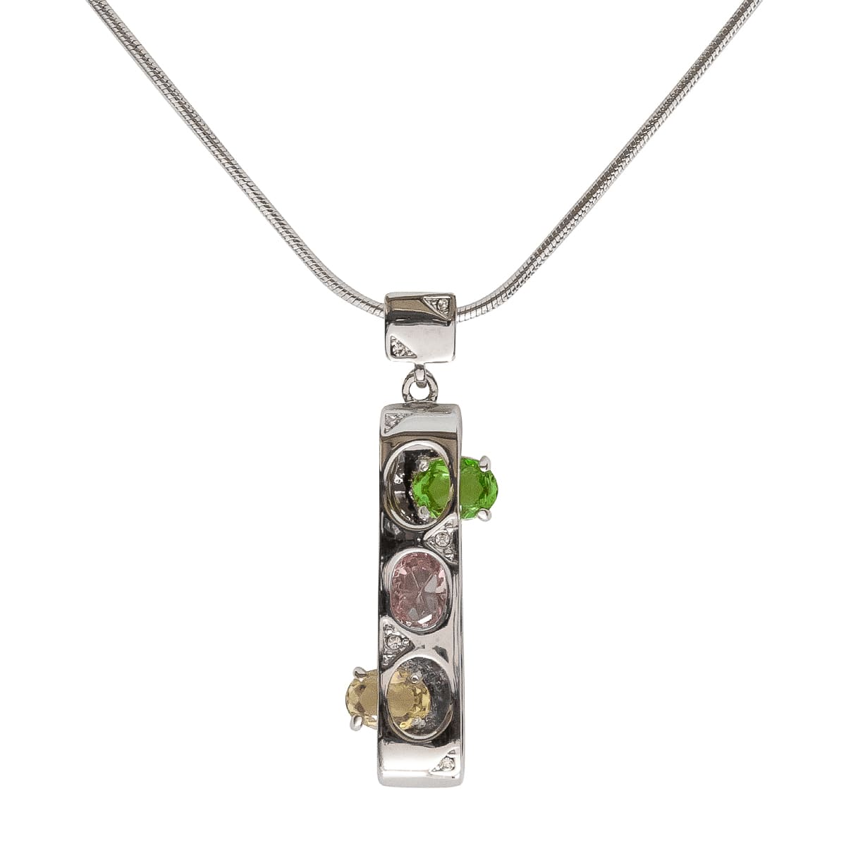 Hier wurde eine Ampel mit leuchtenden Schmucksteinen ausgestattet. Durch den Facettenschliff der Schmucksteine funkelt der Anhänger besonders schön. Eine dezente Schlangenkette unterstützt das Schmuckstück. Ein tolles Accessoire für jeden Tag.