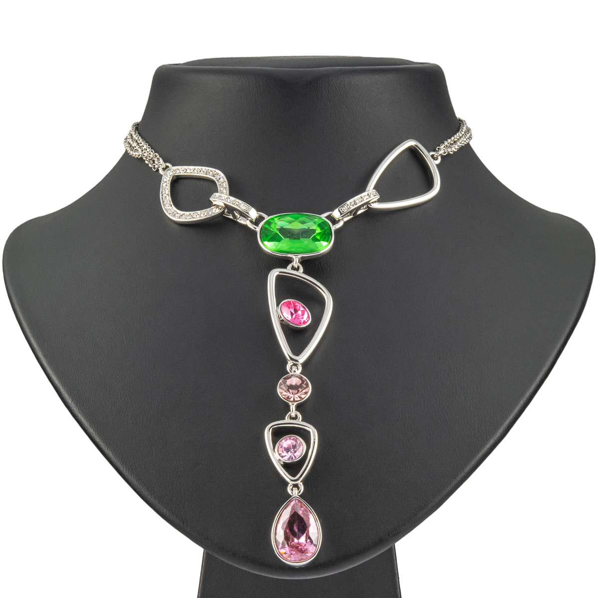 Eine dreireihige Kette zeigt formschön gestaltete Glieder, zum Teil mit funkelnden Schmucksteinen umrandet in Dekolleté schmeichelnder Y-Form. Farblich strahlen die schicken Schmucksteine in sattem Grün und verschiedenen Rosatönen im edlen Facettenschliff. Ein toller Stylingbegleiter zu vielen Gelegenheiten.
