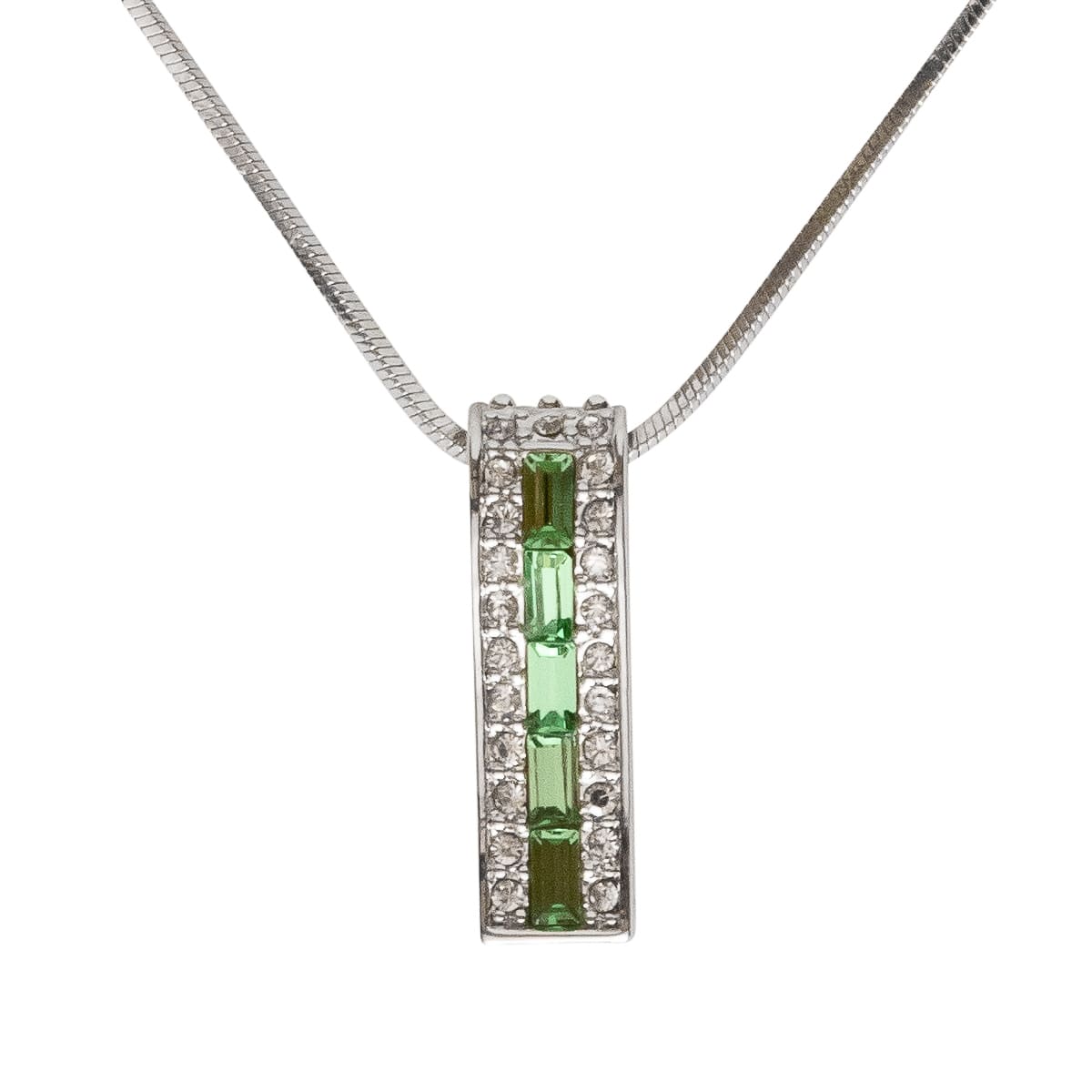 Klassisch, schlicht und zeitlos überzeugend. Der filigrane Anhänger an der Schlangenkette zeigt leuchtend grüne Baguettesteine, die von funkelnden Schmucksteinen umrandet werden. Ein Schmuckstück das sich perfekt kombinieren lässt.