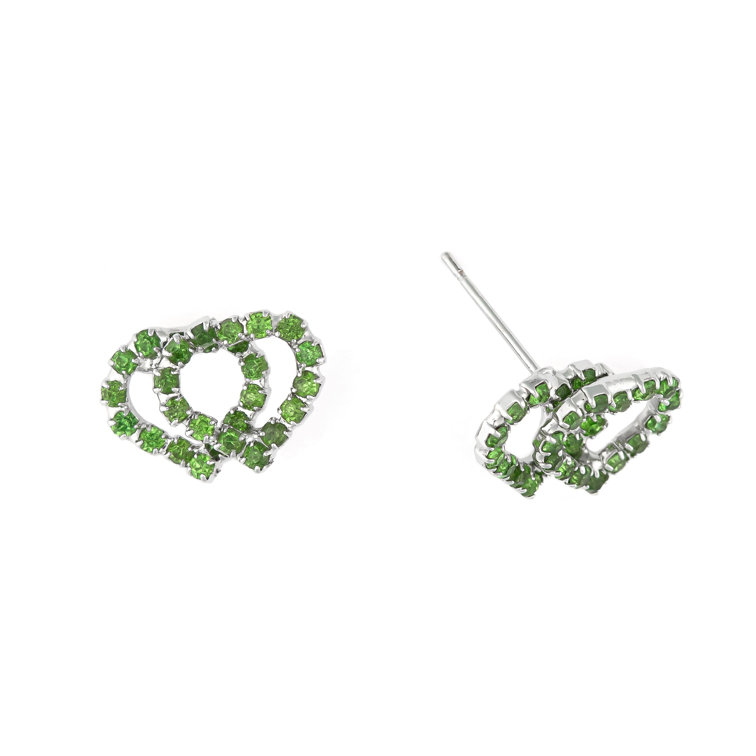 Zwei ineinander verschlungene Herzen als Zeichen der Liebe werden von funkelnden grünen Schmucksteinen gekonnt begleitet. Ein kleines Highlight für jeden Tag.