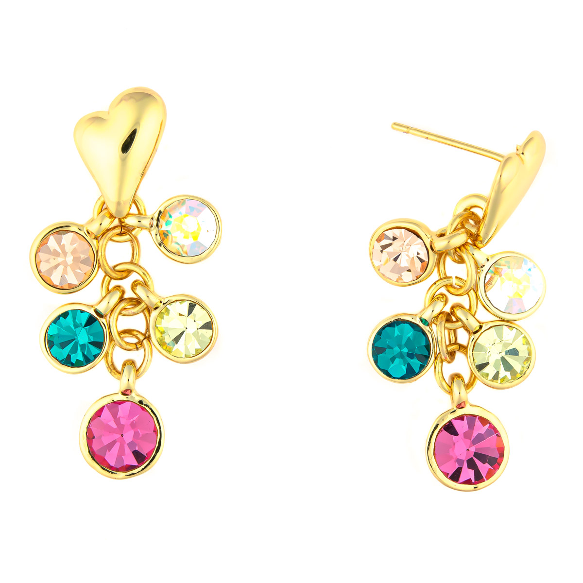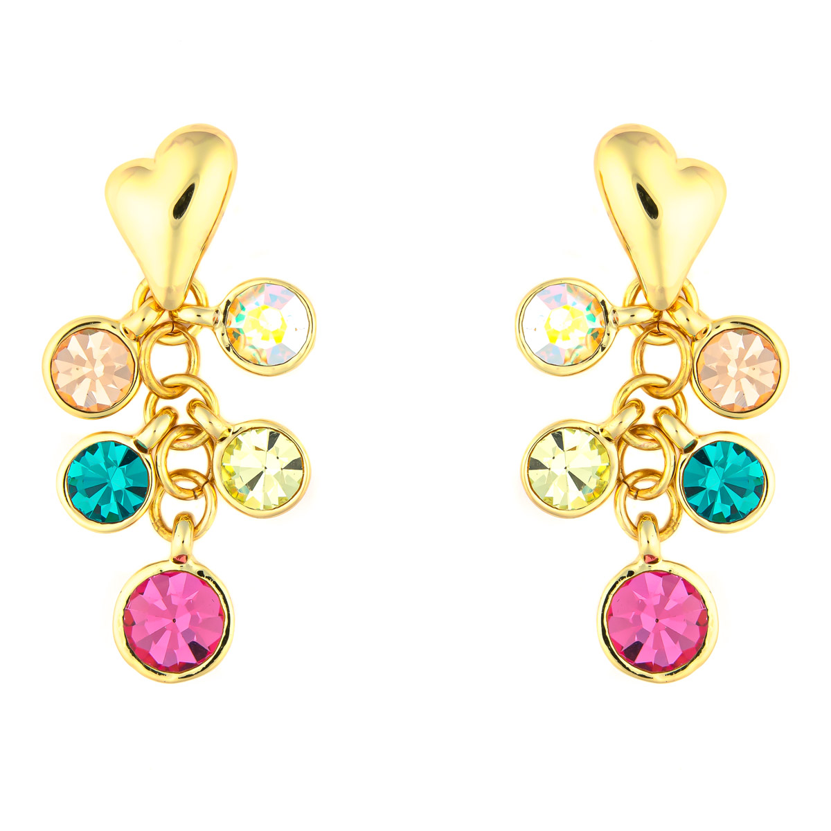 Buntschimmernde funkelnde Schmucksteine in verschiedenen Farben wurden als einzelne Anhänger geschickt an den Herzohrsteckern vereint. Mit dem goldfarbenen Herzen und seinen farbenfrohen, beweglichen Begleitern ist das auffällige Design komplett.