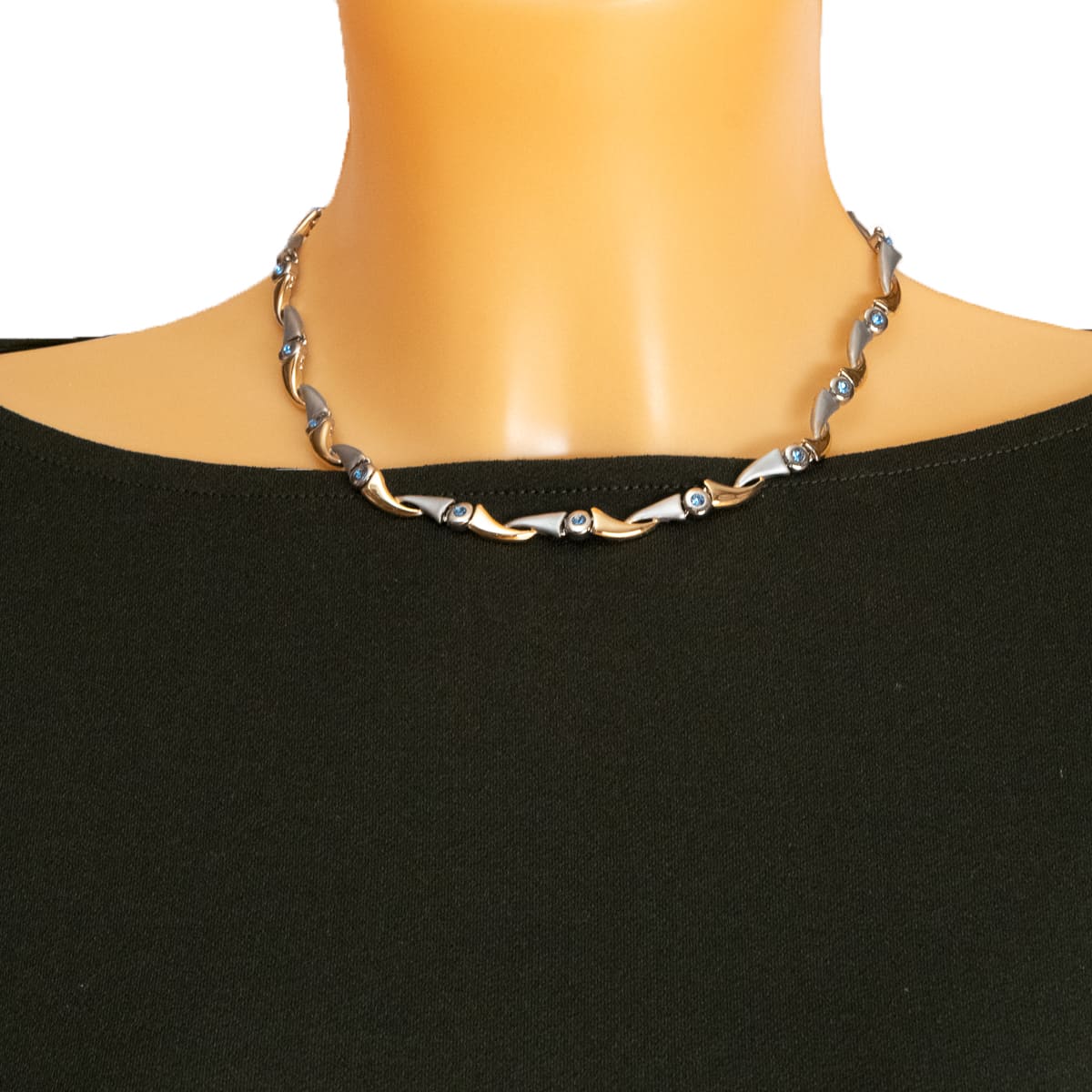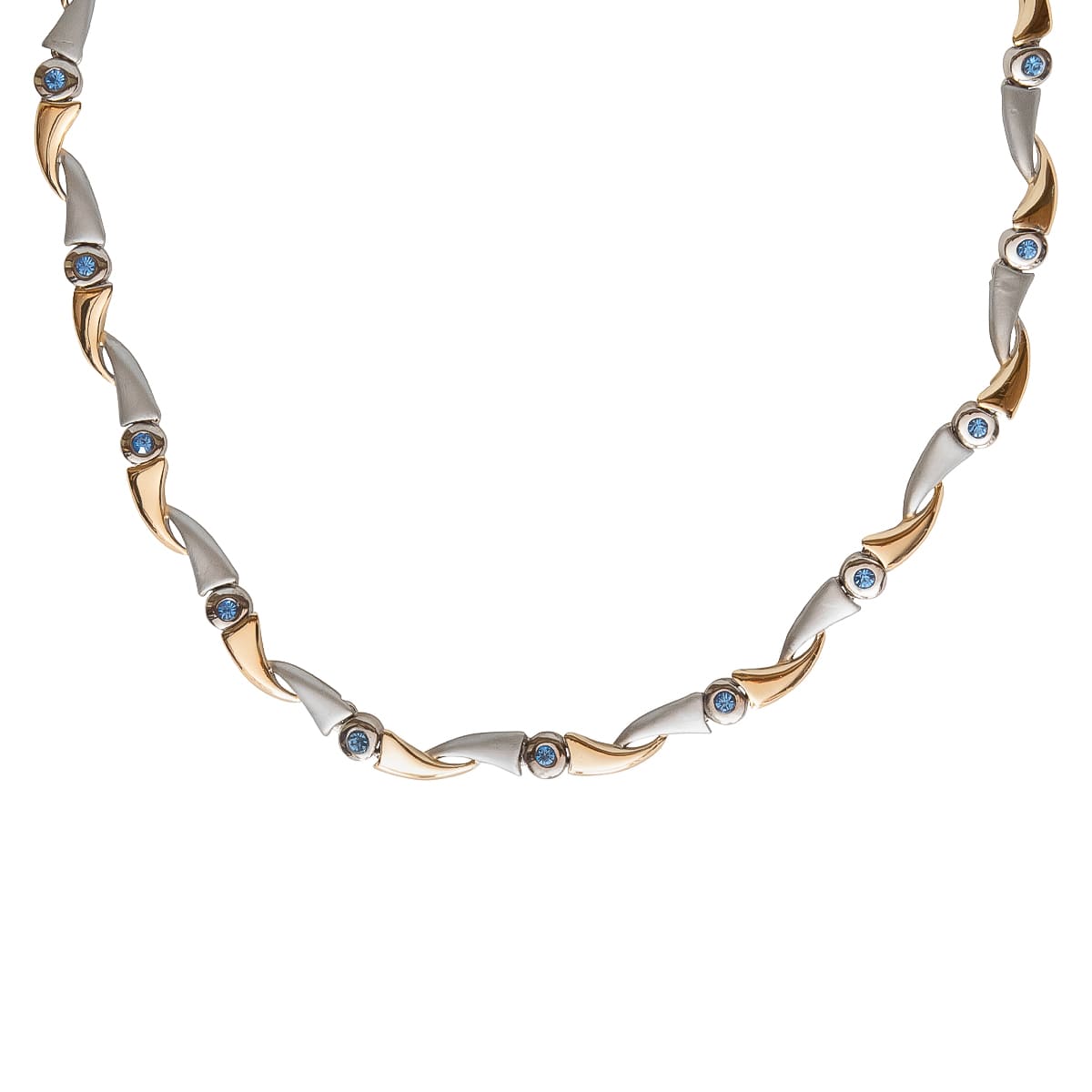 Das elegante Gliedercollier in bicolor setzt mit blauen Steinen Akzente. Geschwungene Glieder, gegenüberliegend angeordnet passen sich harmonisch ins Gesamtkonzept der klassischen Linie ein. Eine schöne Kombination von gold, silber und blau. Die stilvolle Ergänzung für Ihren Look.