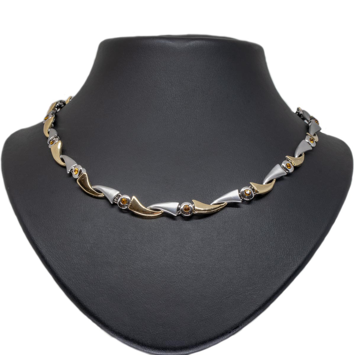 Das elegante Gliedercollier in bicolor setzt mit orangefarbenen Steinen Akzente. Geschwungene Glieder, gegenüberliegend angeordnet passen sich harmonisch ins Gesamtkonzept der klassischen Linie ein. Eine schöne Kombination von gold, silber und orange. Die stilvolle Ergänzung für Ihren Look.