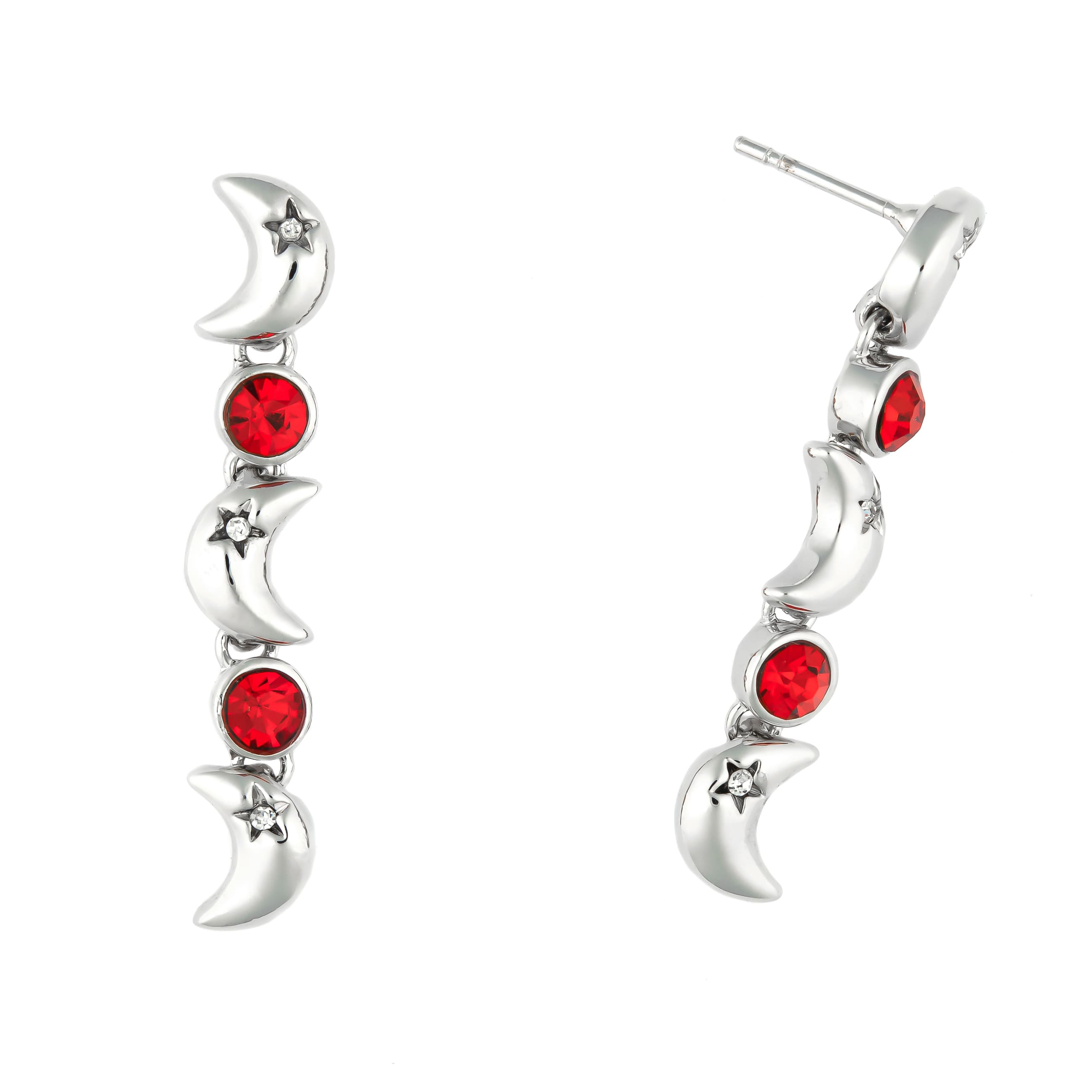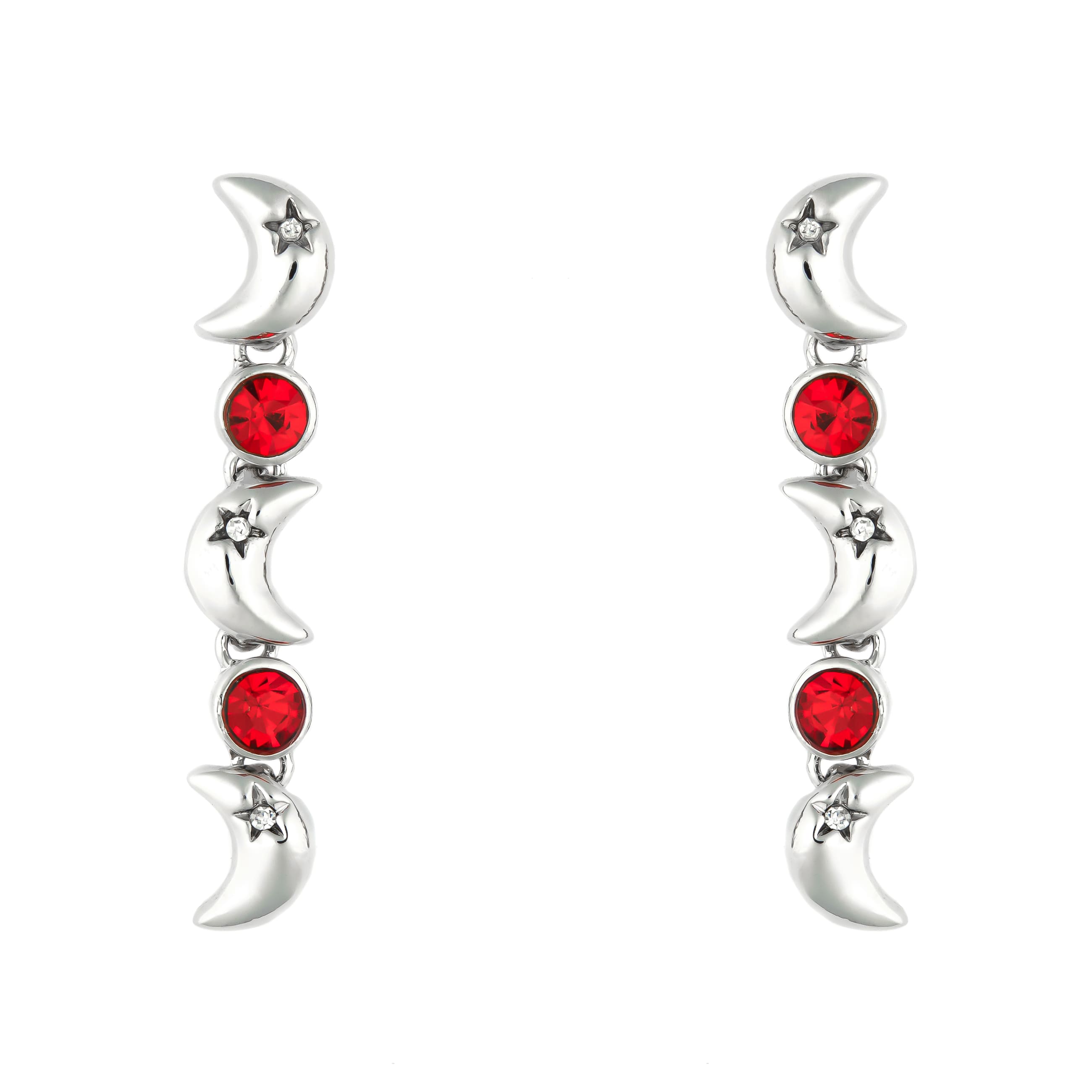 Drei kleine Halbmonde wechseln sich mit funkelnden Schmucksteinen in ansprechendem rot gekonnt ab. Der verspielte lange Ohrstecker kann zu vielen Outfits getragen werden.