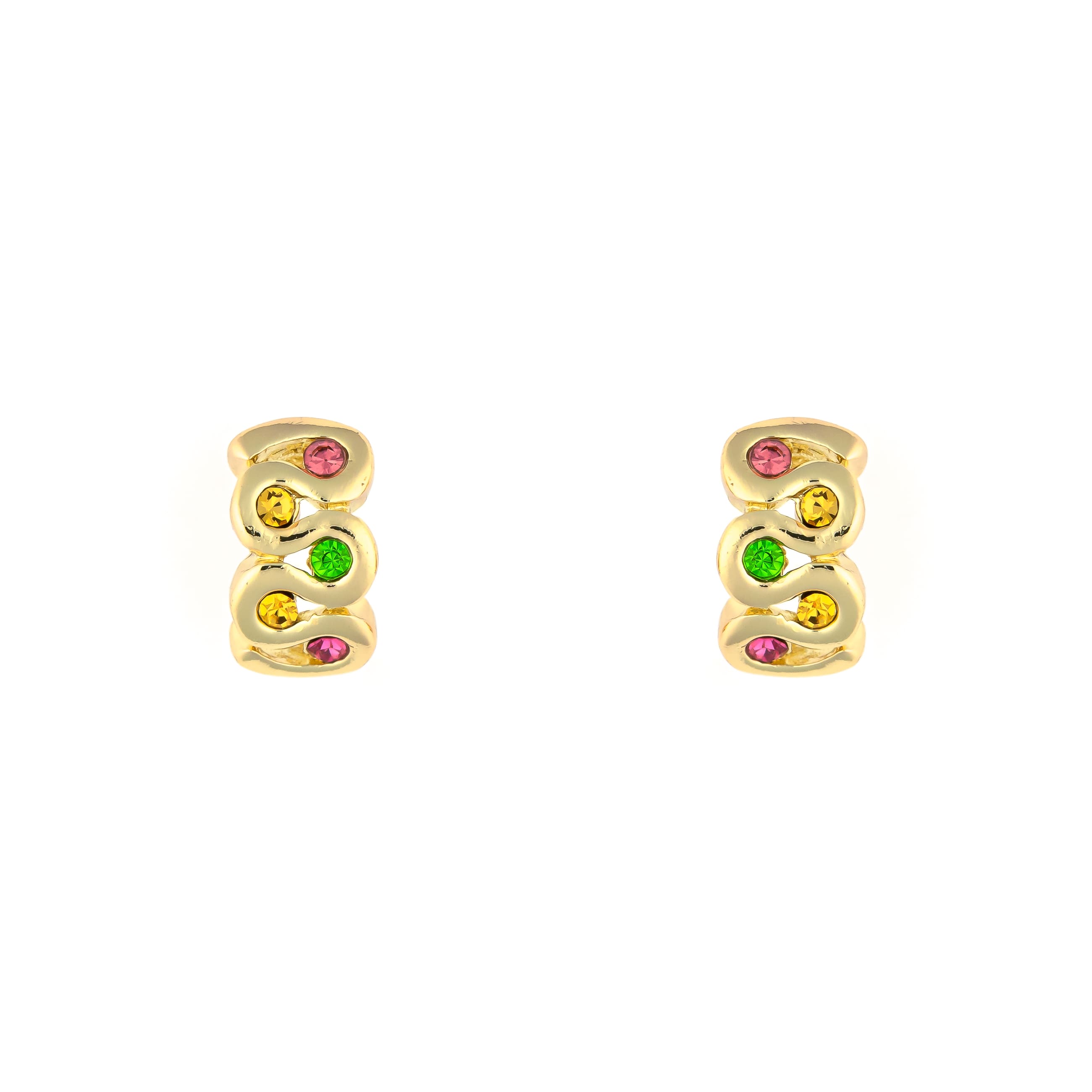Verspielt in gewellter Optik werden die goldfarbenen Ohrstecker von funkelnden Schmucksteinen begleitet. Pink, Grün und Gelb wechseln sich gekonnt ab und verleihen den Ohrsteckern Glanz.