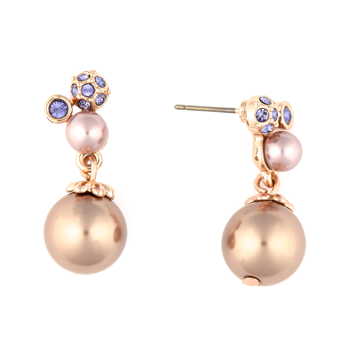 Die vielfältig gestalteten Ohrstecker zeigen sich als elegante rotgoldene Schmuckstücke. Hier wurden funkelnde violettfarbene Schmucksteine gekonnt mit beigen Perlen kombiniert. Als Hingucker dient die untere beige Perle, die frei beweglich ist. Das klassische Design mit modernem Einfluss wird zum vielseitigen Kombi-Partner.