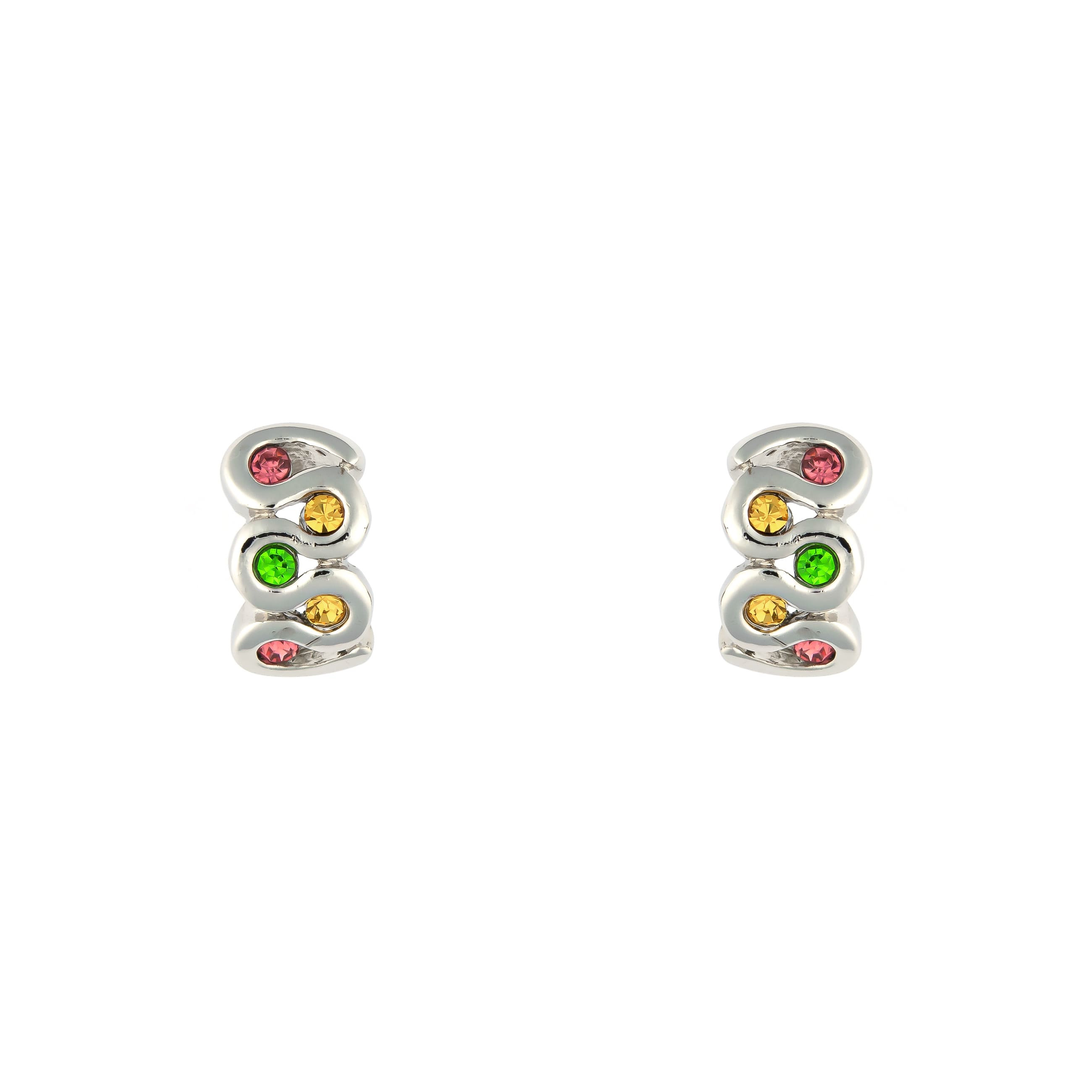 Verspielt in gewellter Optik werden die silberfarbenen Ohrstecker von funkelnden Schmucksteinen begleitet. Pink, Grün und Gelb wechseln sich gekonnt ab und verleihen den Ohrsteckern Glanz.