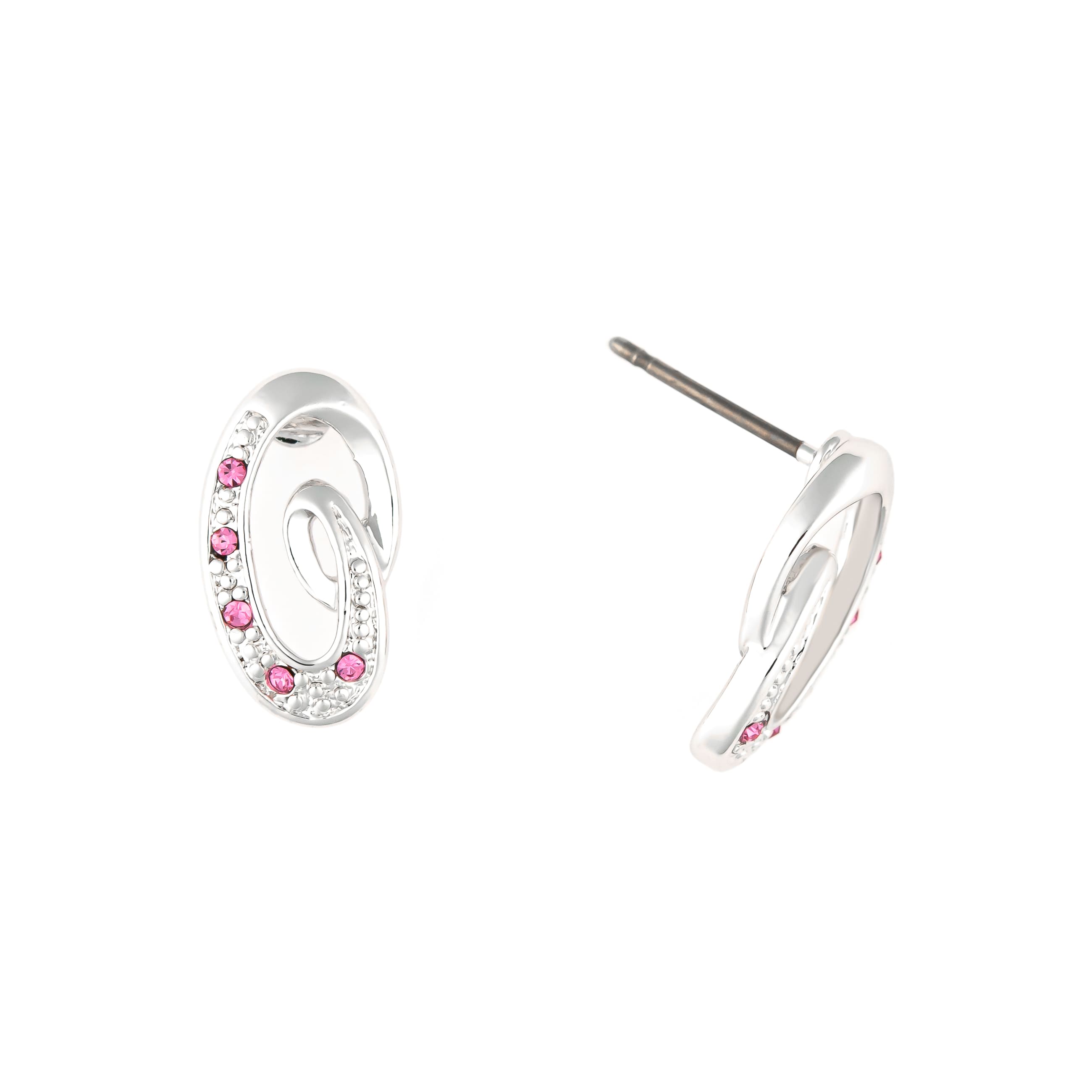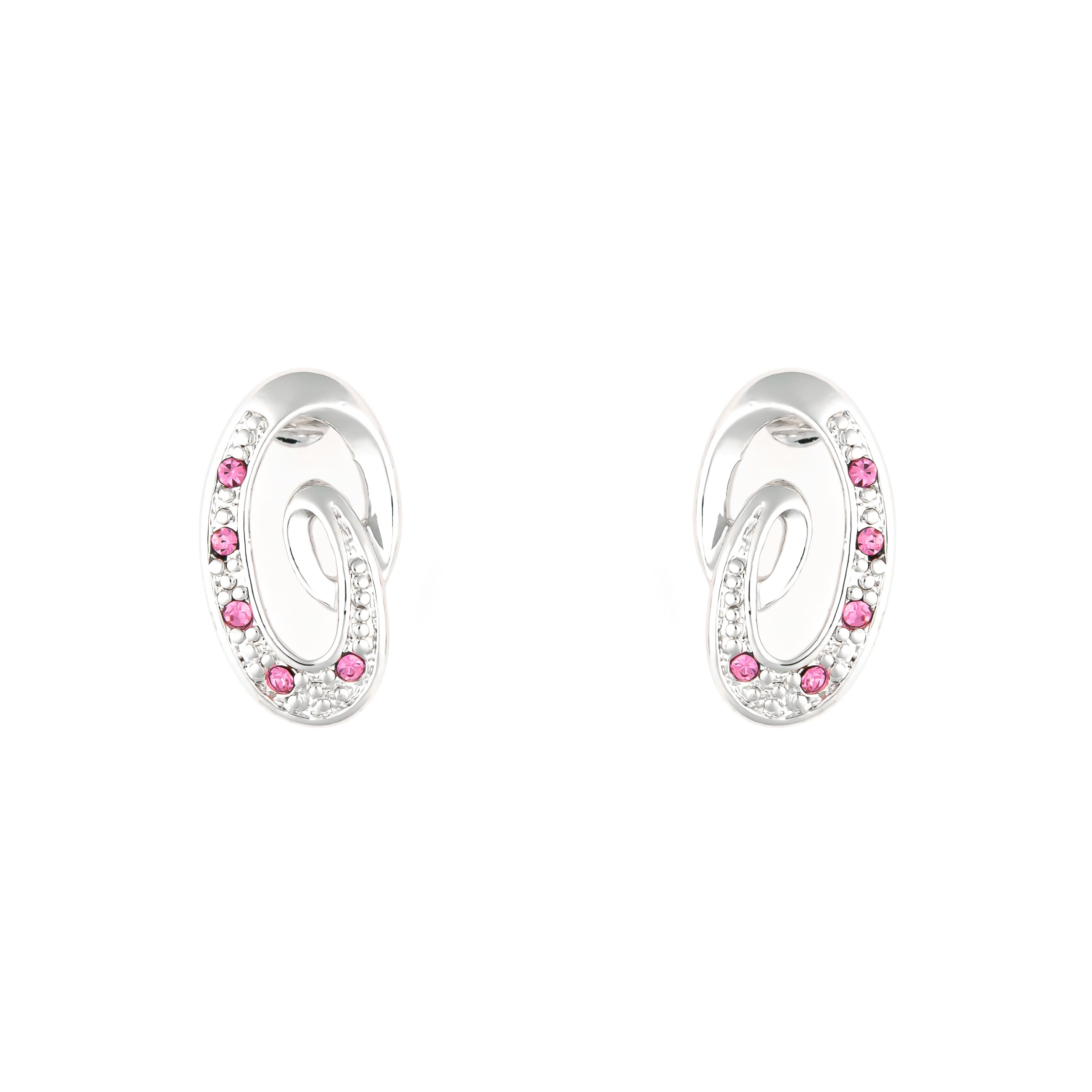 Ein toller Begleiter für jeden Tag. Die nierenförmigen, silberfarbenen Ohrstecker überzeugen mit gekonnt gestaltetem Muster und funkelnden Schmucksteinen in schickem pink.