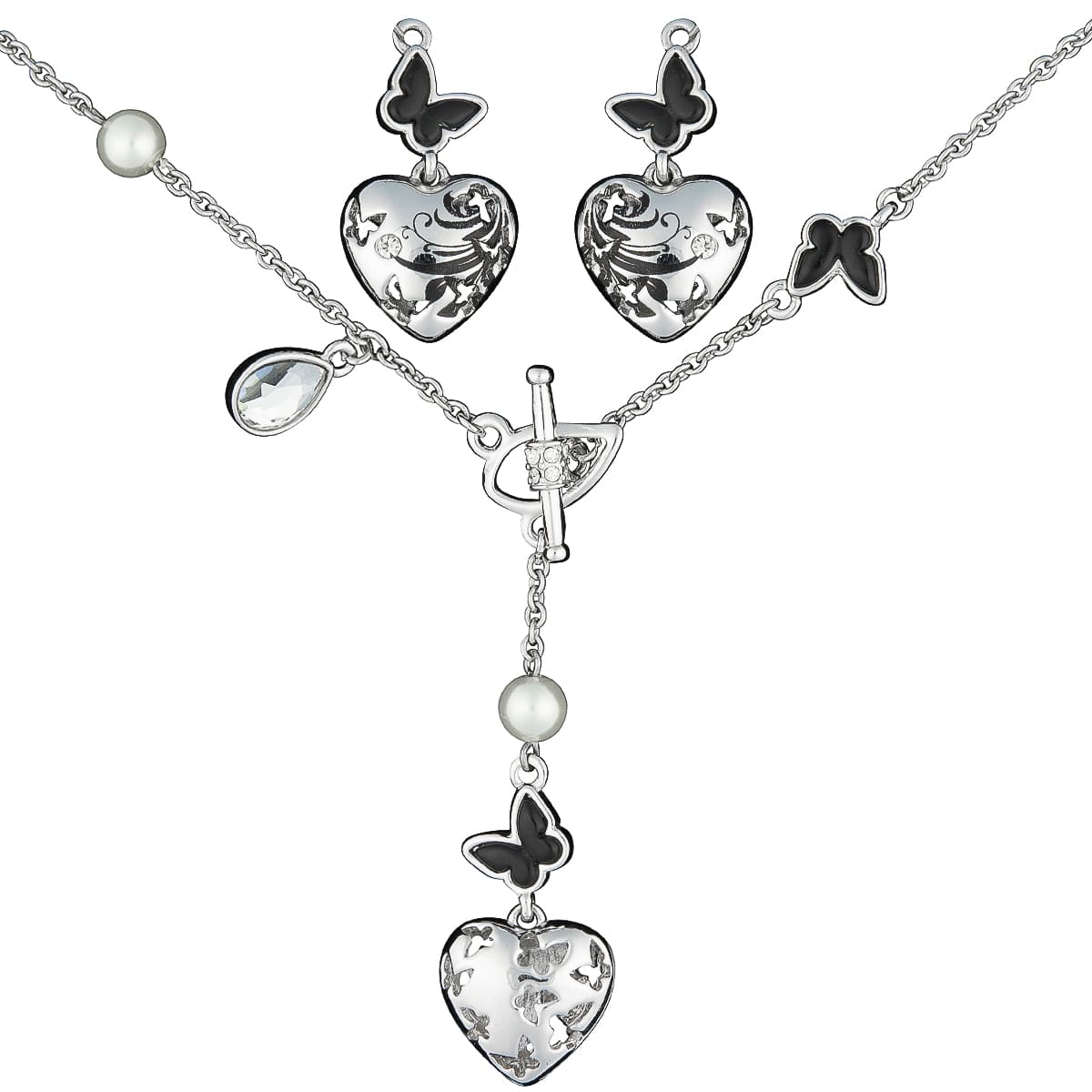 Das Symbol der Liebe mit der Leichtigkeit des Schmetterlings in perfekter Harmonie. Die liebevoll gestaltete Ankerkette mit weißen Perlen, schwarzen Schmetterlingen und funkelnden Schmucksteinen zeigt als Anhänger ein verziertes Herz. Der Knebelverschluss lässt sich von vorne öffnen und setzt die Y-Kette perfekt in Szene. Passend zur Kette ergänzen zauberhafte Ohrhänger den liebevollen Look.