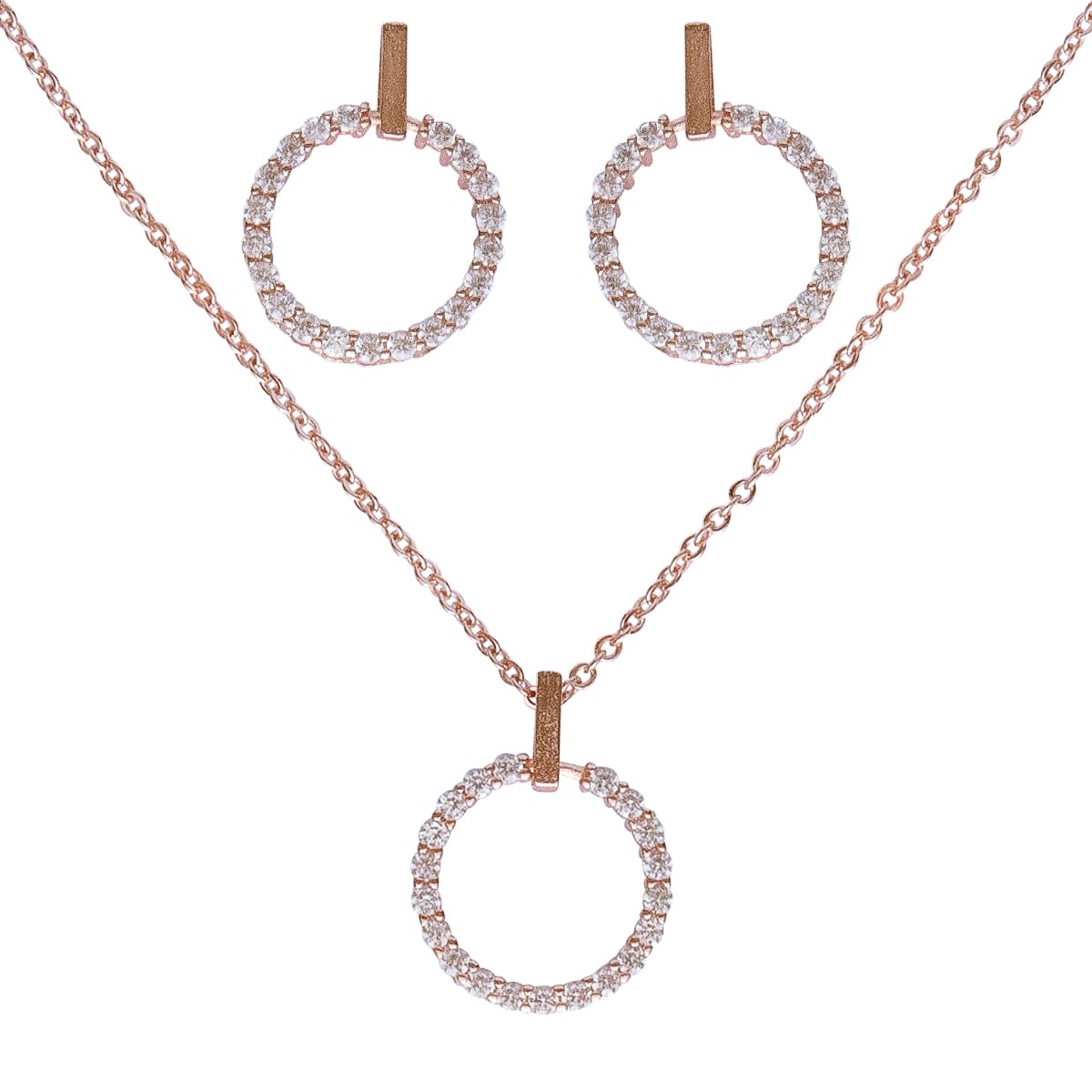 Perfekt aufeinander abgestimmt ist das Schmuck-Set in trendigem Rotgold. Die filigrane Ankerkette begleitet einen mit funkelnden Schmucksteinen besetzten Ring. Zum Set gehören die passend gestalteten glitzernden Ohrstecker. Das klassische Design ist grenzenlos kombinierbar. Egal ob leger oder elegant gekleidet immer ein dezenter Begleiter.