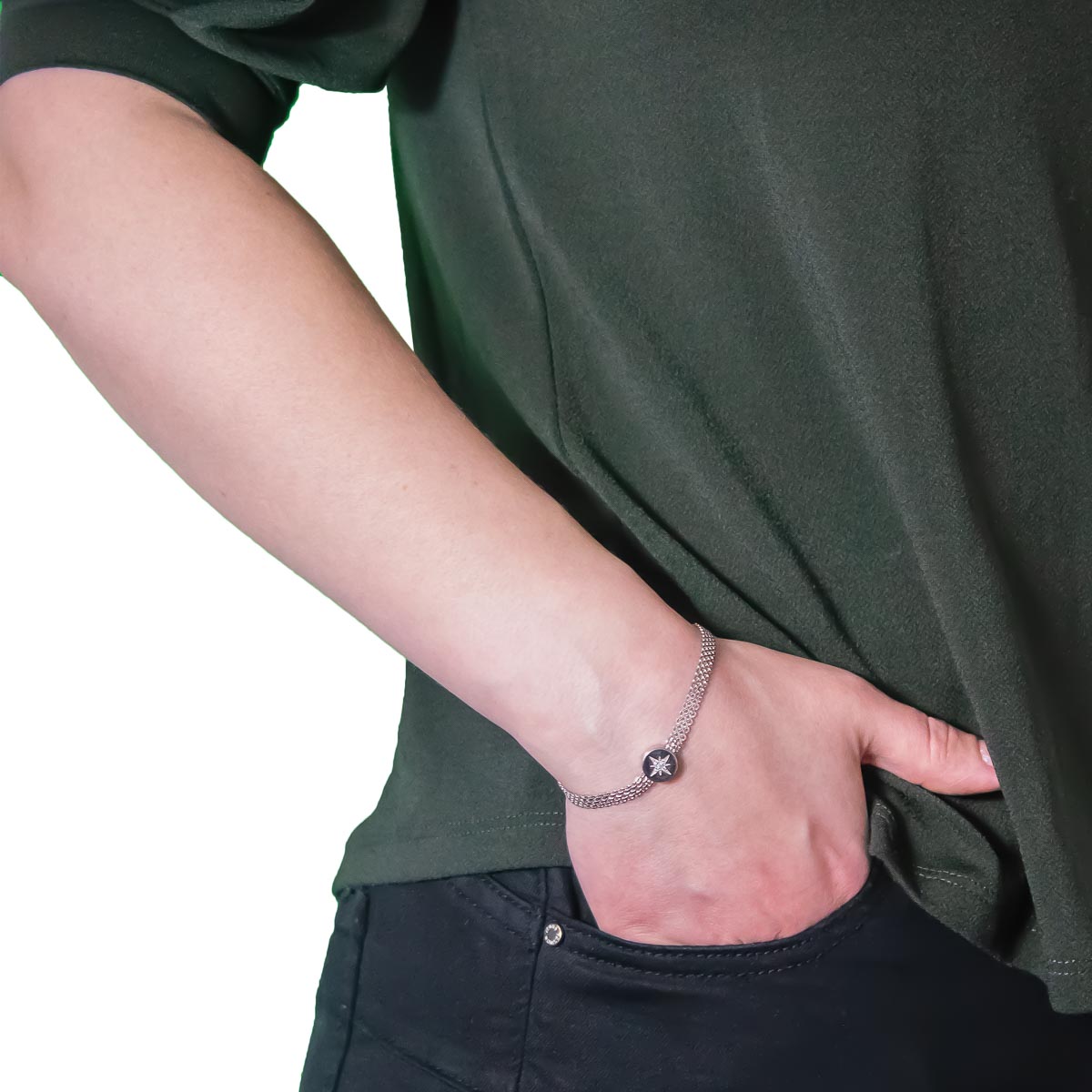 Zum echten Hingucker wird das schicke Silberarmband am Handgelenk. Der Trend mit geometrischen Formen wurde hier durch einen Kreis umgesetzt. Ein Stern, dargestellt aus funkelnden Zirkonia, wurde im Kreis gekonnt integriert. Dieser wurde auf die glänzende Bismarck-Kette aufgefädelt und verleiht dem Armband Glamour. Der Clipverschluss des 925 Silber Armbands sorgt für bequemes An- und Ablegen am Handgelenk. Ein tolles Schmuckstück, das jedes Outfit aufwertet.