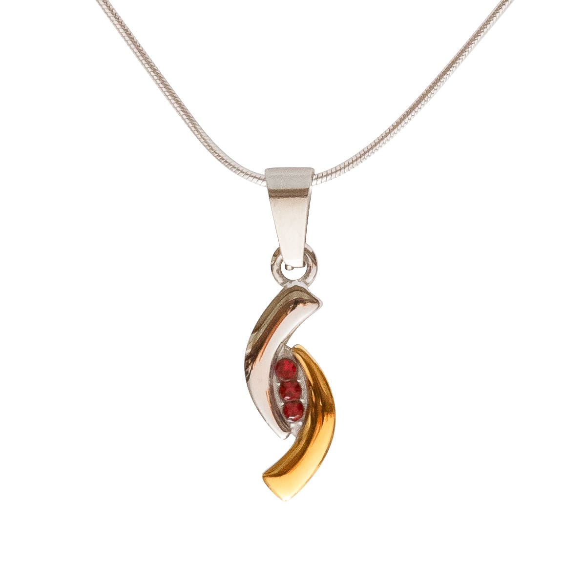 Der formschön geschwungene Edelstahl-Anhänger in bicolor setzt die rubinroten Schmuck-Steine gekonnt in Szene. Eine 45 cm lange Schlangenkette aus 925 Silber macht das Schmuckstück komplett. Das zeitlose Design unterstreicht jeden Look perfekt.