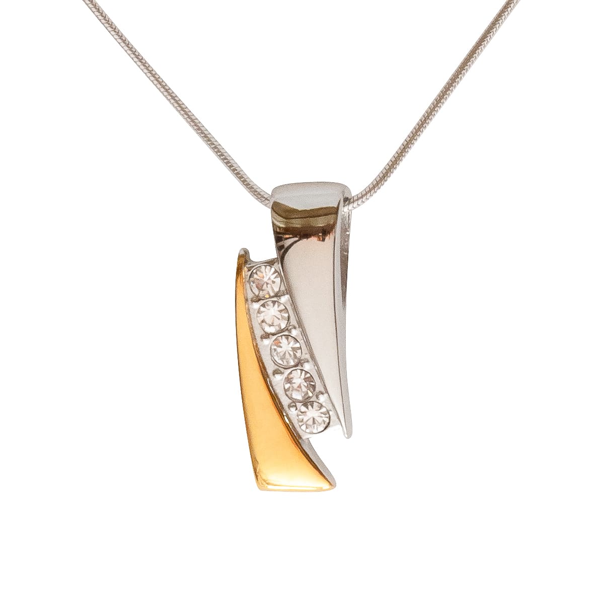 Der elegante Edelstahl-Anhänger in bicolor setzt mit funkelnden Schmuck-Steinen Akzente. Geschwungene Glieder, gegenüberliegend angeordnet passen sich harmonisch ins Gesamtkonzept der klassischen Linie ein. Zusammen mit der 45 cm langen 925 Schlangenkette ein faszinierendes Schmuckstück. Klassisch, schlicht und zeitlos überzeugend.