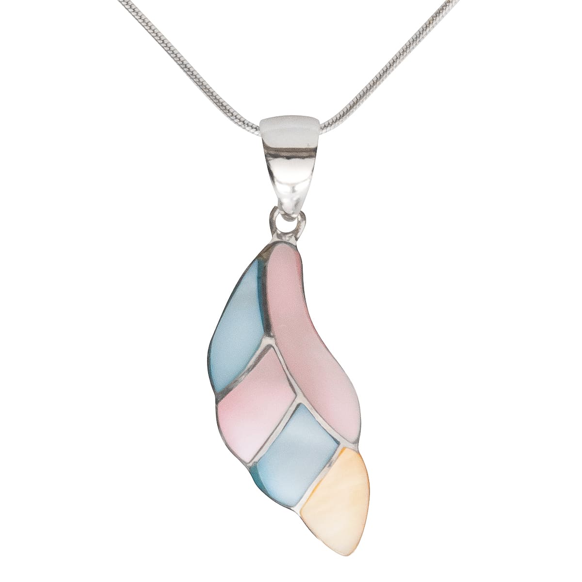 Die Leichtigkeit wird symbolisch von einer Feder dargestellt. Der 925 Silberanhänger greift das Design mit schimmerndem Perlmutt in Blau, Rosa und Gelb gekonnt auf. Mit Liebe zum Detail wurden zarte Silberstege zur Formgebung eingearbeitet. Für den besseren Tragekomfort wurde die Rückseite mattiert. Begleitet wird der Anhänger von einer 45 cm langen 925 Schlangenkette. Ein schöner Begleiter für jede Gelegenheit.