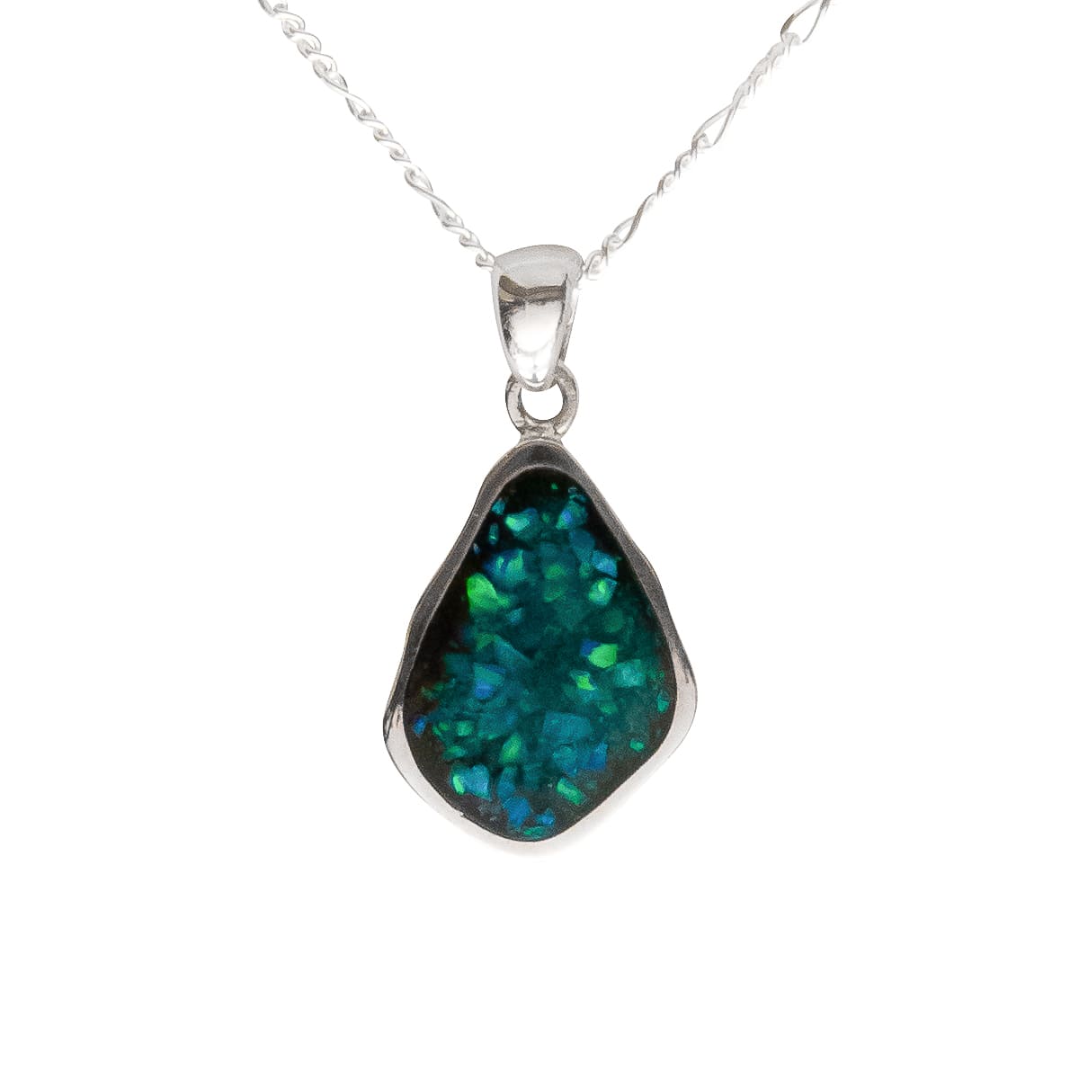 Ein Schmuckstück für jede Gelegenheit ist der elegante 925 Silberanhänger. Die Farbreflexe des grünschimmernden Recon-Opal werden durch die Silberfassung gekonnt verstärkt. Der Anhänger wird von einer 45 cm langen 925 Figarokette ergänzt. Perfekt zu kombinieren.