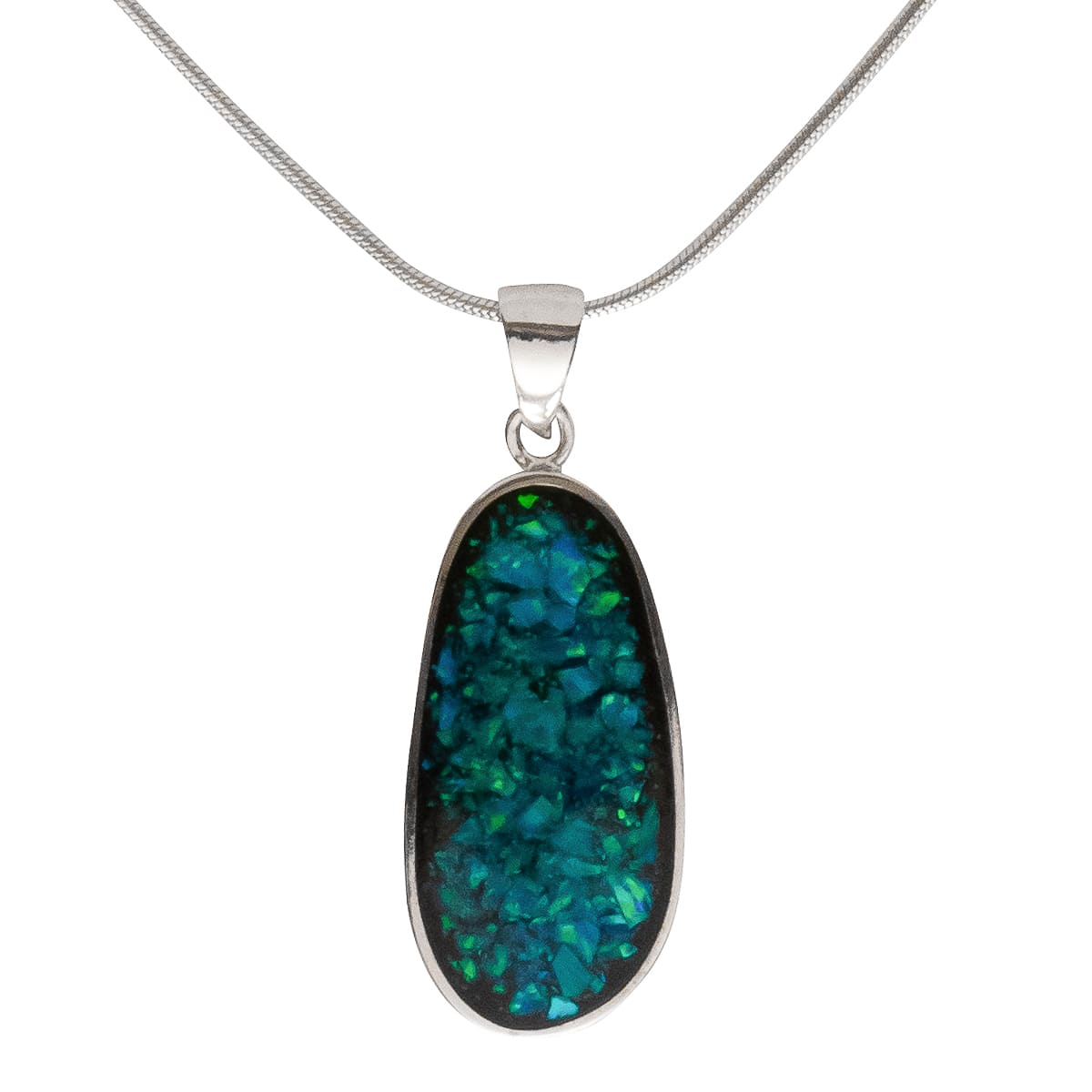 Der klassisch schlichte 925 Silberanhänger ist ein toller Begleiter für jeden Tag. Die Farbreflexe des grünschimmernden Recon-Opals werden durch die Silberfassung gekonnt verstärkt. Getragen an einer 45 cm langen 925 Figarokette ein elegantes Schmuckstück.