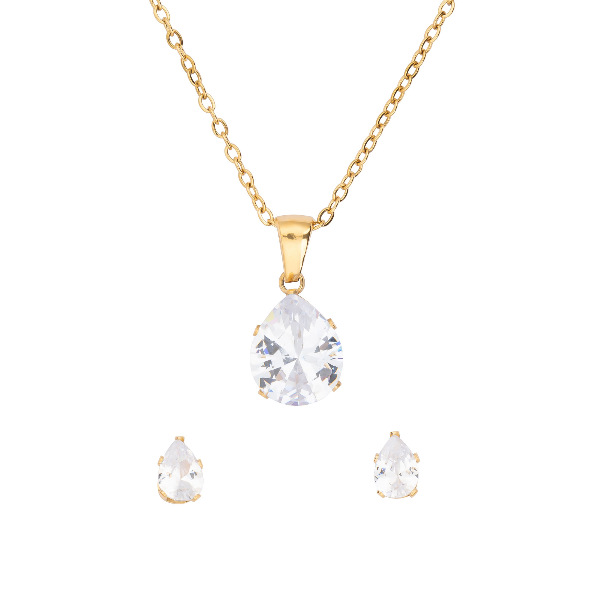 Dieses Damen-Schmuckset setzt auf einen eleganten Klassiker: Ein tropfenförmiger, weiß funkelnder Stein steht im Mittelpunkt und sorgt für einen hochwertigen, femininen Look. Kette und Ohrstecker sind perfekt aufeinander abgestimmt und passen sowohl zu schlichten Alltags-Outfits als auch zu festlichen Anlässen. Die goldfarbene Edelstahl-Ausführung ist langlebig und pflegeleicht, während der Karabinerverschluss sicheren Halt bietet. Ein stilvolles Set, das jedes Styling sofort veredelt - auch als Geschenk eine sichere Wahl.