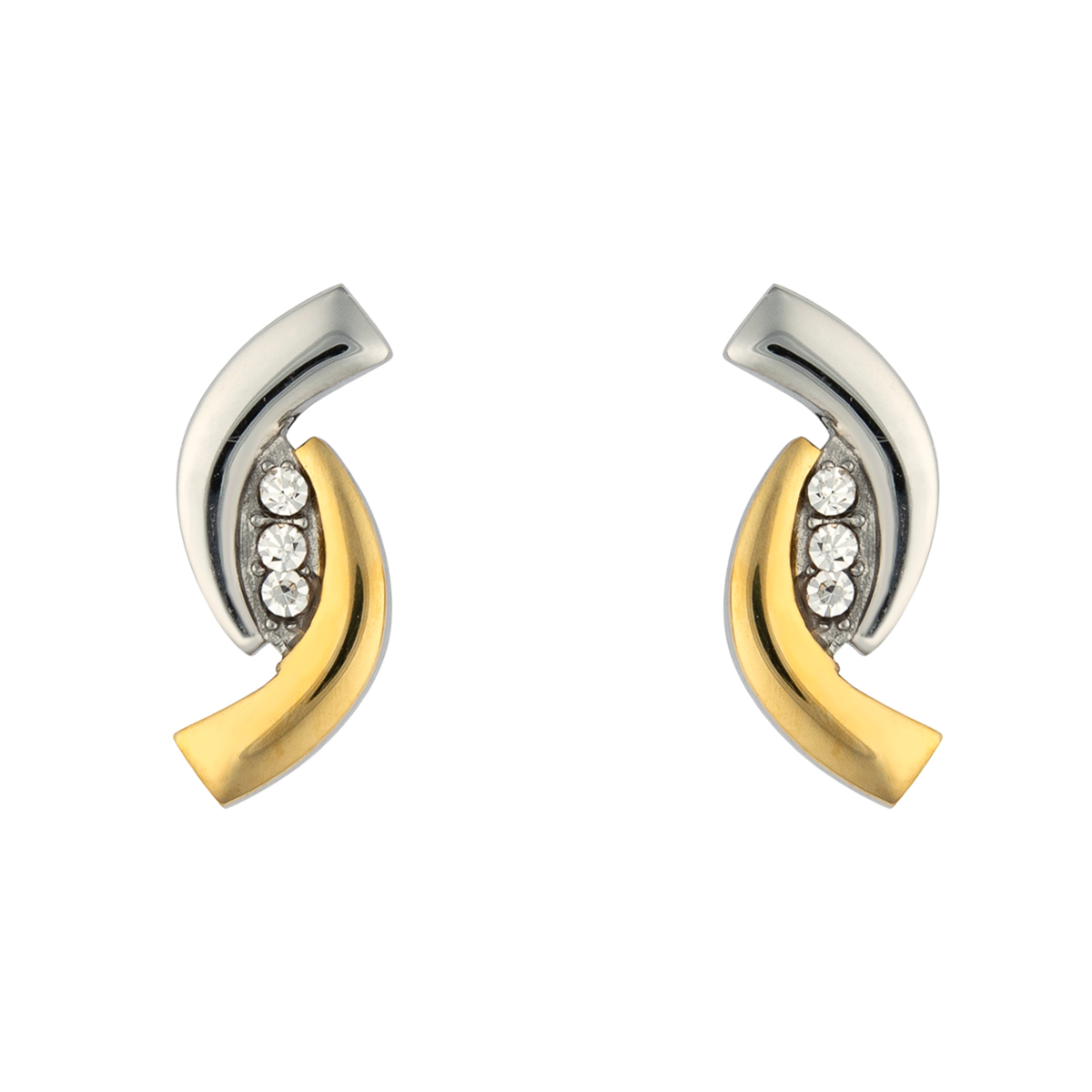 Das Farbenspiel von Gold und Silber wird bei dem Edelstahl-Ohrstecker von formschönen Elementen hervorgehoben. Funkelnde Schmucksteine unterstützten das Design gekonnt. Ein Schmuckstück für jede Gelegenheit.