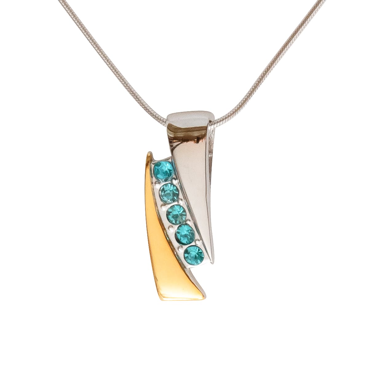 Der elegante Edelstahl-Anhänger in bicolor setzt mit aquamarinblauen Schmuck-Steinen Akzente. Geschwungene Glieder, gegenüberliegend angeordnet passen sich harmonisch ins Gesamtkonzept der klassischen Linie ein. Zusammen mit der 45 cm langen 925er Schlangenkette ein faszinierendes Schmuckstück. Klassisch, schlicht und zeitlos überzeugend.